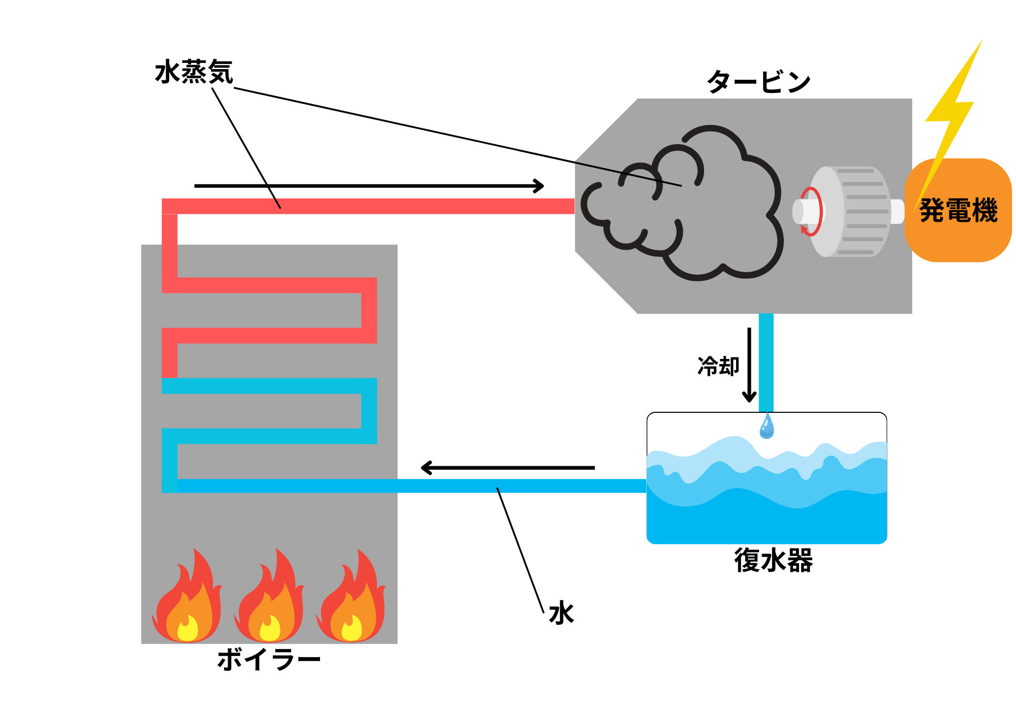 汽力発電⋯化石燃料を燃やして蒸気を発生させ、その蒸気を発電機につながったタービンにぶつけて羽を回すことでエネルギーを生み出す方法です(下図)。発生した蒸気は復水器で冷却された水に戻り、再び蒸気となってタービンを回すために使われます。