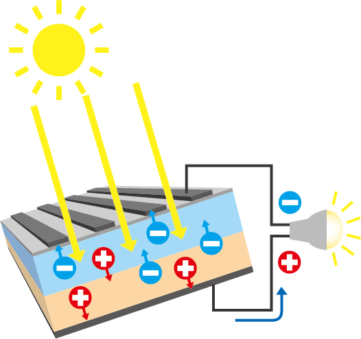 太陽光発電とは、半導体を重ねた*シリコン系太陽電池*が主流で、光が当たるとp型では電子、n型では正孔が生じ、それぞれ反対側に移動して電流を発生させる仕組みです。