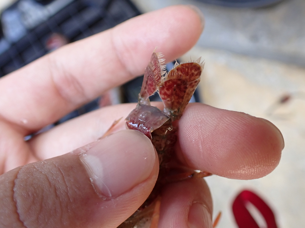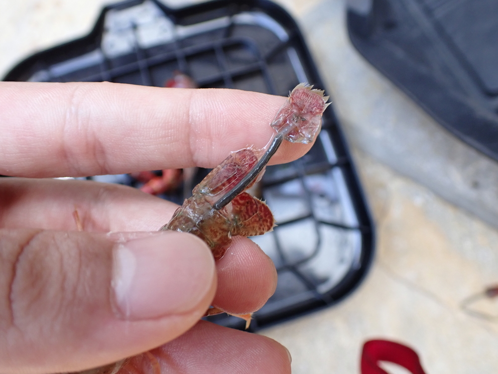 持ち帰ったらまず、炭酸水などを使って締めてください。締めたら、背びれの真ん中をねじって引っ張るっことで背わたを取ることができます。アメリカザリガニは雑食性でいろいろなものを食べるので、背わたを抜かないと臭みや苦みの原因になってしまうので、必ず取り除きましょう。