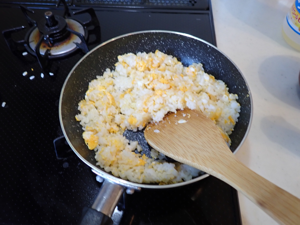 1.油をひいて、熱したフライパンに卵とご飯を入れて、炒めます。