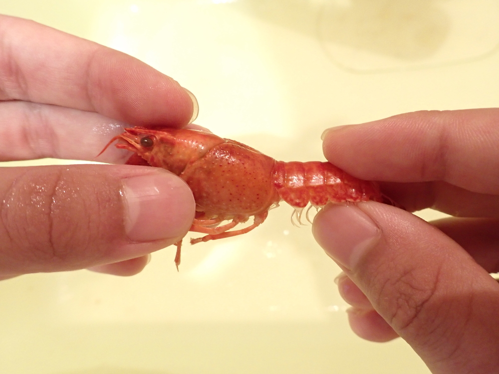 そしたら、アメリカザリガニの胴体と腹部を分けます。胴体には内臓が詰まっており、臭みや苦みの原因になるので、主に食べるのは腹部の部分です。大型の個体の場合は爪の部分も食べることができます。最後に硬い外骨格を剥けば、下処理は完了です。これで食べることができるようになります。