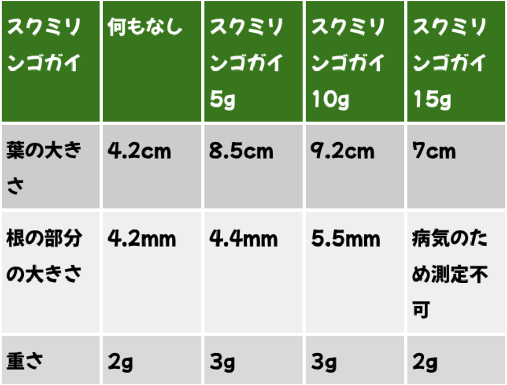 表からもわかる通り、何もなしと、スクミリンゴガイを混ぜたものではスクミリンゴガイのほうがよく成長しているとわかります。15gのものは残念ながら病気に感染してしまい、確かな記録を取ることは出来ませんでしたが、肥料の量を増やすことで、より成長を促進させることができると考えられます。以上の結果からから、スクミリンゴガイの殻には、作物の成長を促進させる効果があると考えられます。よって、スクミリンゴガイは肥料として価値があるとわかりました。
