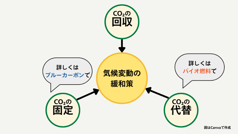 藻類は光合成によってCO₂を吸収するだけでなく、その炭素を自身の体に取り込みます。取り込まれた炭素は、その後海底に長期的に貯留されることで、CO₂が固定され、その結果、温室効果ガスの削減につながっています。(詳しくはブルーカーボン) また藻類を原料とするバイオ燃料は環境負荷の大きい化石燃料の代替となり、さらには、他のバイオ燃料とも比較しても、生産性が高く、地球温暖化防止に大いに貢献します。まとめると、藻類の3つの特性ーCO₂の回収・固定・代替ーを生かした緩和策が行なわれています。
