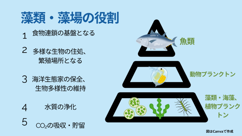 藻類は海洋における食物連鎖の基盤となる重要な存在です。特に藻場は、多様な生物の住処や繁殖場所、餌場として機能し、生物多様性の維持に大きな役割を果たしています。また藻場は光合成によって生物に必要な酸素を供給するとともに、水質の浄化にも貢献しており、海洋生態系の保全に欠かせません。さらに、藻場はCO₂を吸収・貯留する「ブルーカーボン生態系」の一部として、気候変動対策の観点からも重要視されています。まとめると、藻類、特に藻場は、生物多様性を支え、海洋生態系の保全に重要な役割を果たし、結果として豊かな海の恵みを未来につなげることができます。