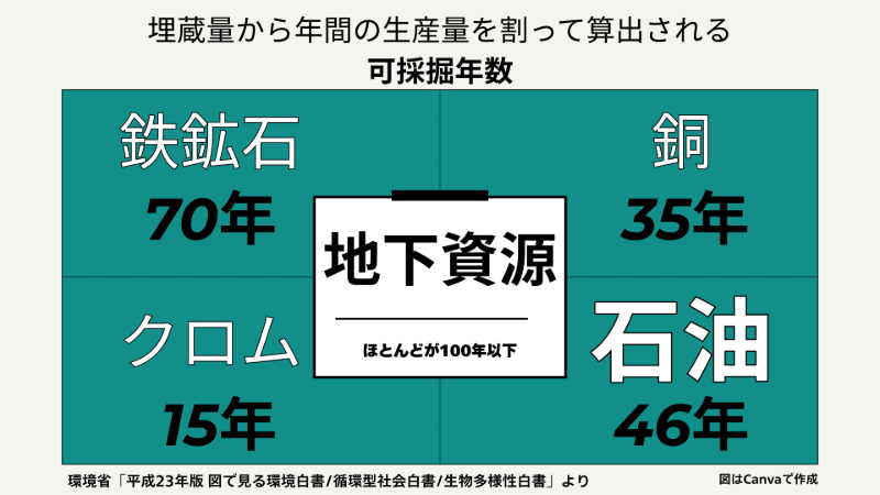 実際に、確認されている埋蔵量から年間の生産量を割って算出される可採掘年数を見ると、鉄鉱石は約70年、鉛は約20年、銅は約35年、金は約20年、クロムは約15年、石油は約46年とされており、多くの地下資源が100年を下回っています。(環境省「平成23年版 図で見る環境白書/循環型社会白書/生物多様性白書」より)