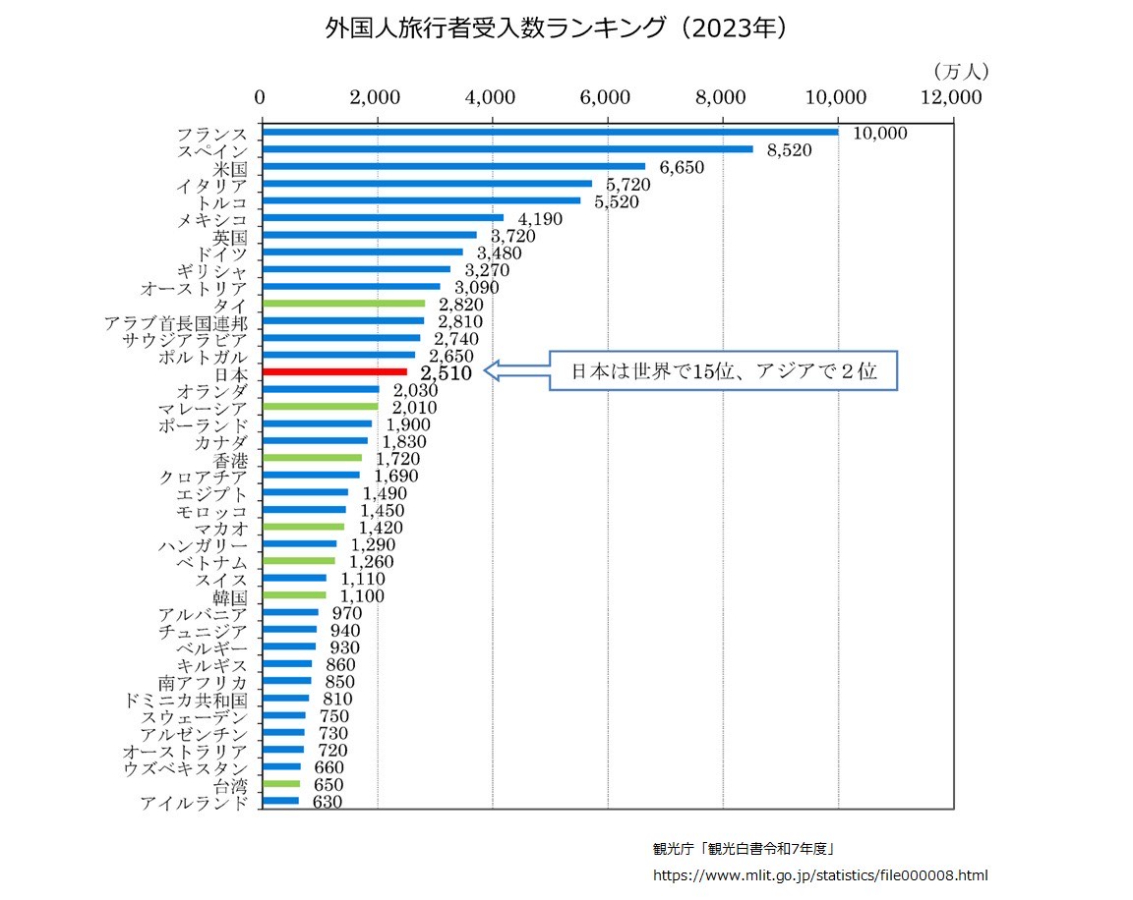 観光庁の「外国人旅行者受入数ランキング(2023年)」によると、フランスを訪れる外国人旅行者が世界で最も多く10,000万人となっています。 日本は2,510万人で世界15位となっていてアジアで2位です。これは、日本の観光立国としての取り組みが実を結ぶ結果となっていると考えます。