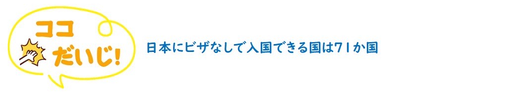 入国ビザの要件が緩和 日本は、以下の表の71の国・地域に対するビザ免除措置を実施しており、日本にビザなしで入国することができます。 ビザの取得には手間や時間、費用がかかるため、ビザの取得が不要であることで手軽に旅行ができ、インバウンド増加要因となります。 次のページに進む>> << 前のページに戻る
