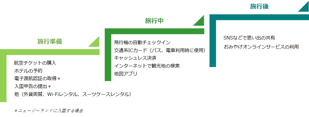 航空チケットやホテルの予約、ビザの取得(必要な場合)、入国申告の申請などの旅行の準備から始まり、旅行中の移動のための交通系ICカード、食事代や買い物代のキャッシュレス決済、スマホで観光地の検索や地図アプリの使用し、旅行後は写真の共有をするのが現在の旅行のスタイルで、多くのことがデジタルでおこなうことができます。