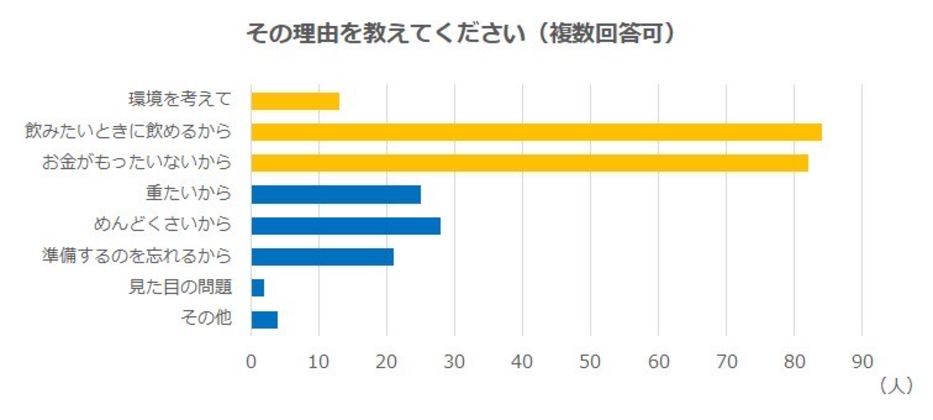 Q4の結果から多くの生徒が水筒を持参していることがわかりました。しかし、持参していない生徒も一定数いたり、必ず持参している人は3割であることもわかりました。また、Q5の結果から水筒を持参する人は「飲みたいときに飲めるから」「お金がもったいないから」という理由で持参していることがわかりました。一方で持参していない人は「重たいから」「準備するのを忘れるから」「準備するのがめんどくさいから」という意見が出ました。ポイ捨てされるゴミの割合が最も多いのはペットボトルであるため、水筒を持参することを呼びかけることで、ペットボトルのポイ捨てを防げると考えます。そのためにも、水筒を普段から持参したいと思うような仕組みをつくる必要があると考えます。