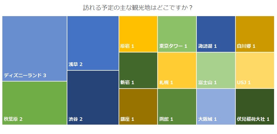 〇ディズニーランド 3人 〇秋葉原 2人 〇浅草 2人 〇渋谷 2人