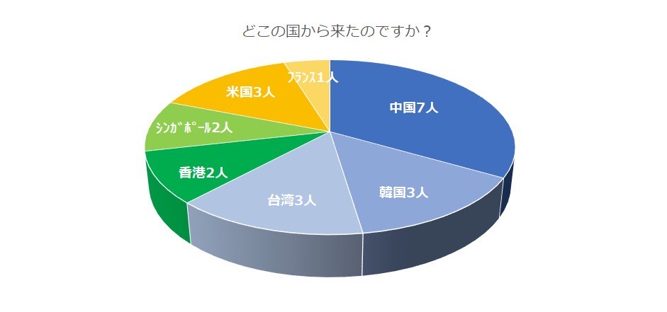 〇中国 7人 〇アメリカ 3人 〇韓国 3人 〇台湾 3人 〇香港 2人 〇シンガポール 2人 〇フランス 1人