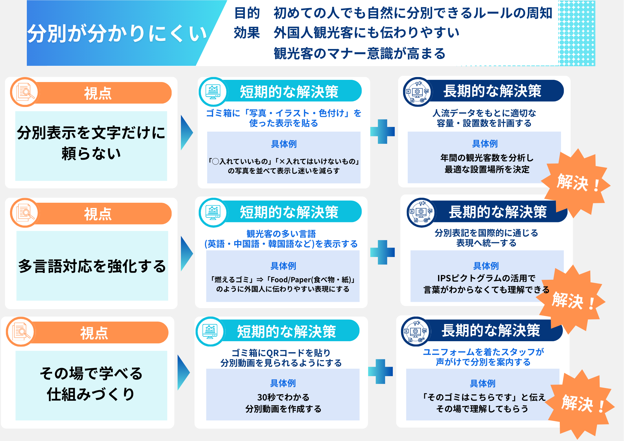 観光地で分別方法が分かりにくい場合には、文字だけに頼らず、 視覚的で分かりやすい表示や多言語対応 を行うことが重要です。