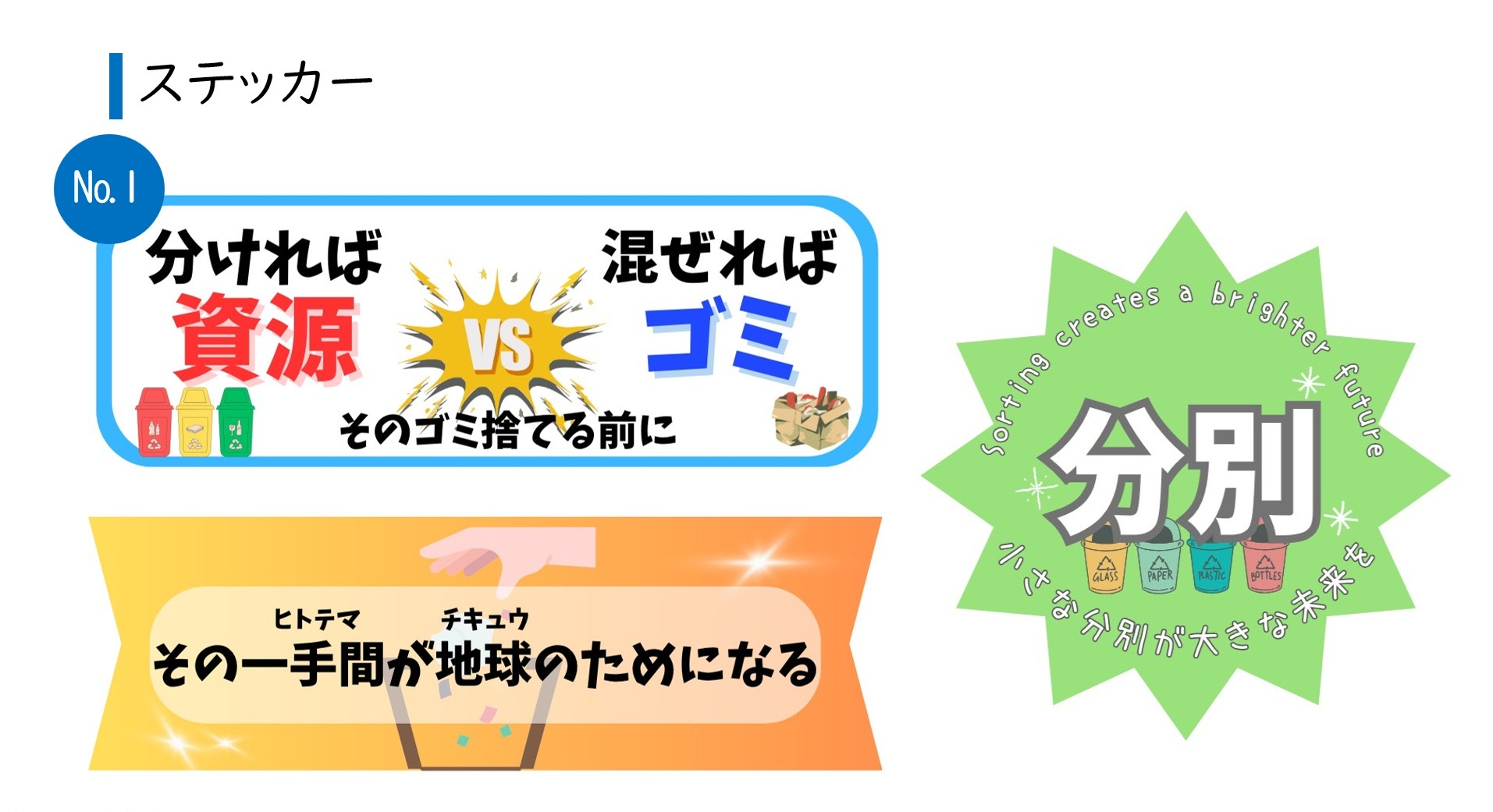 そこで、私たちはポスターとステッカーのデザインを考案し、校内アンケートで最も票を集めたものを採用しました。