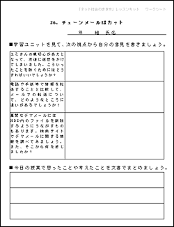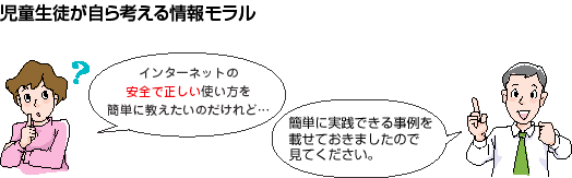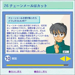 (著作権は独立行政法人情報処理推進機構(IPA)及び経済産業省に帰属します。)アニメーションを見ながら問題点を把握して考える学習ができる親しみやすい教材です。 「ネット社会の歩き方」は,財団法人コンピュータ教育開発センターが実施したプロジェクトで開発されました。このプロジェクトの成果が広く学校や家庭で利活用されるよう,そして家庭の普及を目指して,Webサイト名称「ネット社会の歩き方」を公開しております。 |