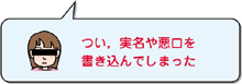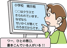 インターネット上の電子掲示板,ブログに書き込まれたことは世界中の人が見ることができます。他人を傷つけるような書き込みは,その人の人権を侵害することになります。名誉毀損や侮辱罪で警察に訴えられることもあります。 |