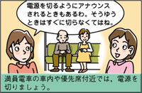使う場所や場面に気をつけよう! 静かにしなくてはいけない場所や使用に制限がある場面,心臓ペースメーカーに電波の影響を及ぼす可能性がある場所などでは,携帯電話の電源を切りましょう。 |