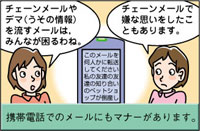 考えようね メールの使い方! メールは気持ちがうまく伝わらないことが多いものです。腹が立つような文面でも冷静に対応しましょう。 チェーンメールや迷惑メールは無視をしましょう。 |