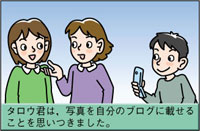 モラルが大切 ディジタルカメラ! 携帯電話のディジタルカメラを使用して,許可なく写真を撮らないようにしましょう。写真を撮る相手や場面に配慮をすることも大切です。 |